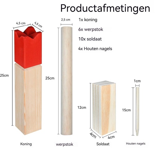 - Werpstokken: 25 × 3 cm (6 stuks)
