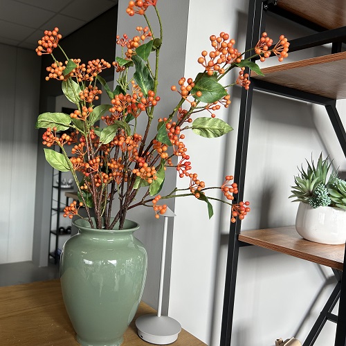 Breng warmte en kleur in huis met deze kunsttak vol oranje bessen. De tak is ongeveer 70 tot 80 cm lang en bevat meerdere fijne vertakkingen. Hierdoor ontstaat een natuurlijk ogend geheel dat direct sfeer toevoegt aan elk interieur.