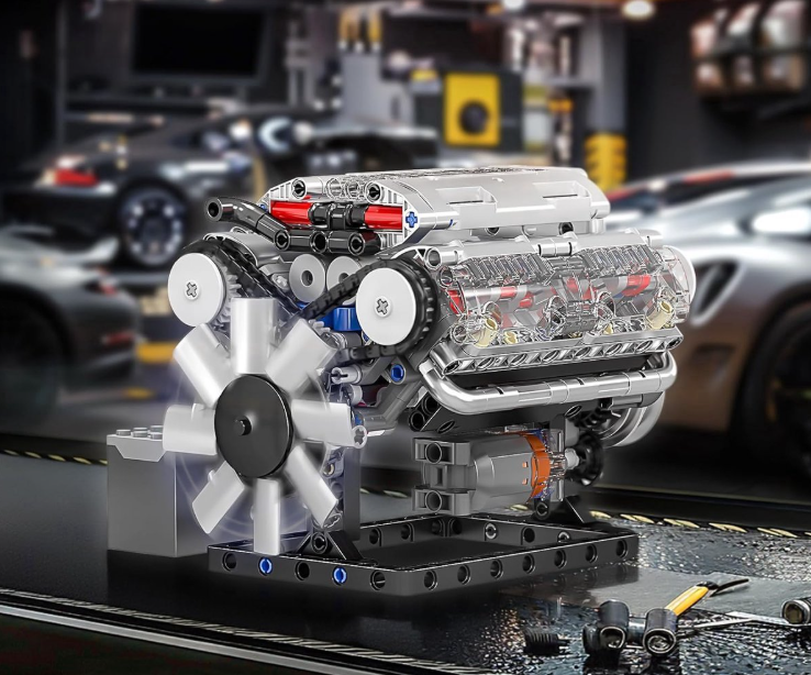 Dankzij de transparante motorkap zijn alle interne bewegingen goed zichtbaar, waaronder de zuigers en het speciale kleppensysteem. De bouwset is voorzien van een elektrische aandrijving die de motor daadwerkelijk laat draaien. Dit zorgt voor een realistische weergave van de werking van een V8-motor en maakt de set geschikt voor demonstraties en educatief gebruik. De meegeleverde batterijbox en motor brengen het model echt tot leven.